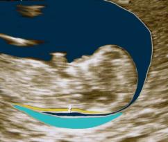 Im Bild rechts ist die Nackentransparenz schematisch dargestellt: es ist der schmale gelbe Streifen. Die fälschliche Messung des hellblauen Feldes oder des dunkelblauen Streifens dazwischen würde zu Fehlinterpretationen und vermeidbarer Beunruhigung der werdenden Eltern führen.