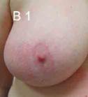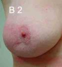 B: Einziehung am Rand des rechten Brustwarzenhofes, nur beim Anheben des Armes (B 2) !