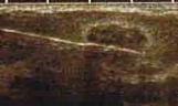 Wenn auch nach einer Ultraschalluntersuchung unklar ist, um welche Art von Knoten es sich handelt, kann in der Praxis eine Gewebsprobe durch Stanzbiopsie entnommen werden. Diese Gewebsprobe wird feingeweblich untersucht, so dass man zu einer ganz sicheren Diagnose kommt. Die folgende Bildreihe zeigt einen unklaren Knoten (links), dann die bis zum Knoten vorgeschobene Nadel (Mitte, die Nadel ist als heller Strich abgebildet) und schließlich den Moment der Gewebsentnahme durch die Nadel im Tumor. Die Patientin aus diesem Beispiel hatte eine gutartige Erkrankung.