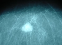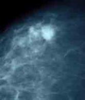 Das linke Bild unten zeigt Mammographieaufnahmen von beiden Brüsten, "rechts" mit einem hellen Fleck, links unauffällig. Die rechte Aufnahme unten zeigt eine Vergrößerung des hellen Flecks, der unscharf begrenzt ist und sich bei der weiteren Untersuchung als Karzinom erwies. Dieser Tumor war übrigens nicht tastbar. Er wurde anläßlich einer Vorsorgeuntersuchung durch Ultraschall entdeckt. Die 80jhr. Patientin wurde brusterhaltend operiert und ist seither gesund.