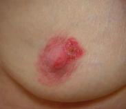 A: Deformierte rechte Brust, Einziehung der Brustwarze: fortgeschrittene Krebserkrankung!