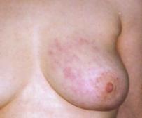 Die unteren Bilder zeigen ein kleines "Ekzem" im Bereich des Warzenhofs als Zeichen einer Krebserkrankung im Inneren der Brust (links) und eine fleckige Hautverfärbung bei fortgeschrittenem Brustkrebs (rechts).