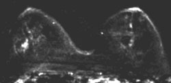 Die Kernspintomographie der Brust ist ein aufwendiges Verfahren, das insbesondere bei unklaren Befunden an der Brust hilfreiche Informationen liefert. Das entscheidende diagnostische Prinzip ist dabei, dass Karzinome eine besondere Gefäßversorgung nach sich ziehen, in denen das Blut anders strömt als in gesunden Gefäßen. Die Kernspintomographie misst letztlich diesen besonderen Blutfluss. Daraus werden dann Rückschlüsse gezogen, um welche Art von Gewebe es sich im untersuchten Bereich handelt. Auf dem Bild unten sieht man auf der links abgebildeten Brust außen einen hellen Fleck: kleines Karzinom.